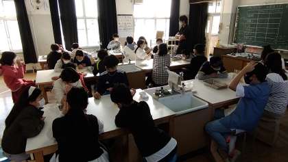 スチールウールとアルミニウムを塩酸・炭酸水・水・食塩水・石灰水・重曹水に入れています。役割分担をして実験に取り組んでいます。