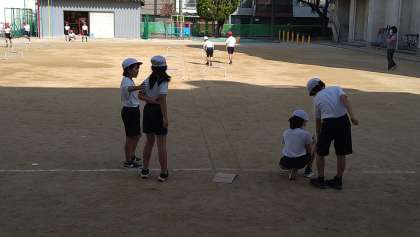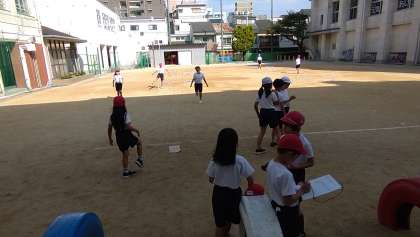 空中姿勢を見合って、個人タイムの向上に向けて取り組んでいます。最後にチーム対抗のリレーをおこなっています。