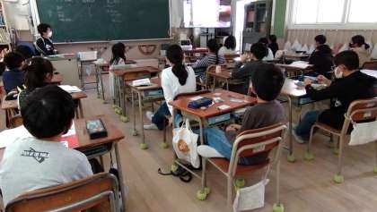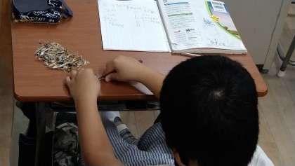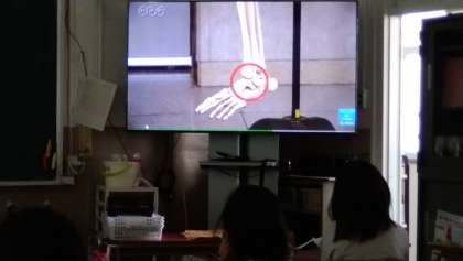 これまで学習したヒトの体と動物の体を比べるために、煮干し(魚)をピンセットを使い解剖しています。馬は映像を見て確認しています。