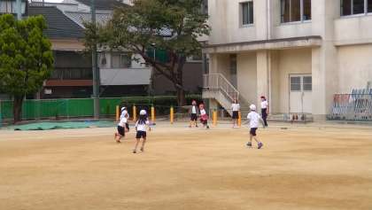 ベースボール型のゲームです。4つのチームに分かれて2つの場所でおこなっています。ボールではなく、柔らかいフリスビーを使っています。