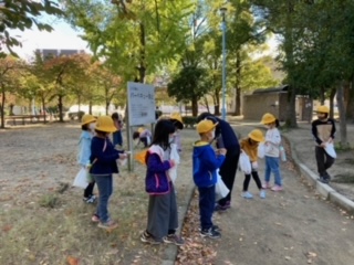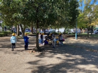 東小橋公園で秋見つけをしています。赤や黄色の葉やどんぐりを拾っています。