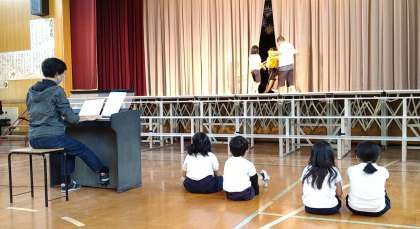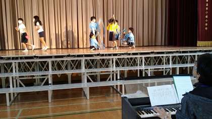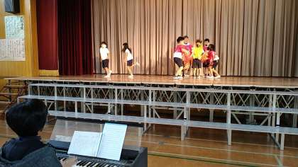 劇の通し稽古をしています。声の大きさや速さに気をつけることに重点をおいて子どもたちに声をかけています。大きな身振り手振りもできるようになっています。