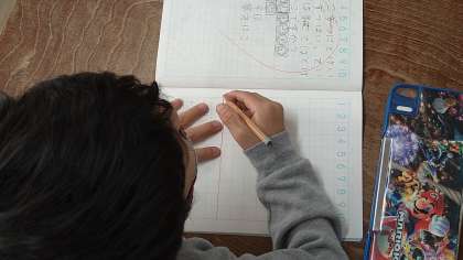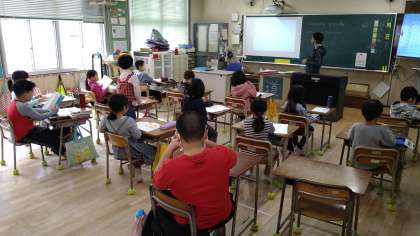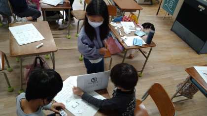 4の段の練習をした後に6の段の学習をしています。ノートに横に使ってかけ算の式と花びらの図をかいてきまりを見つけています。