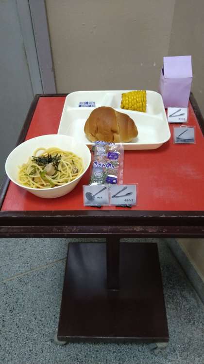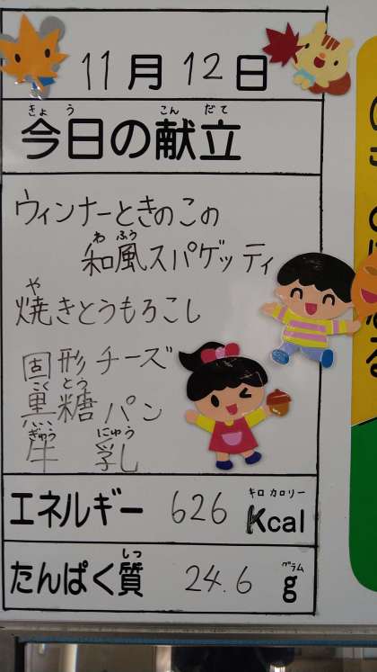 今日の大おかず「ウィンナーときのこの和風スパゲッティ」はにんにくの効いた味に仕上げられています。