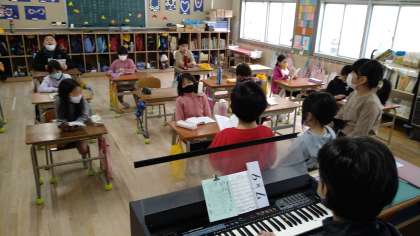 朝の会の最後に歌を歌います。曲は「ぼくのひこうき」です。みんなで元気に歌っています。