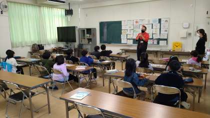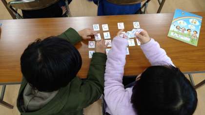 2人にアルファベットカードを配り、ランダムに5枚選び、スヌーキー先生が選ぶカードと同じものが何枚あるかを競い合っています。あった時は、「Yes, I