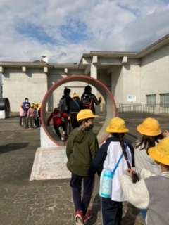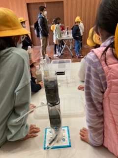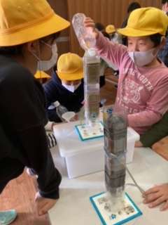 水道菅の大きさを実感して室内に戻り、淀川の水が綺麗になる実験をしています。