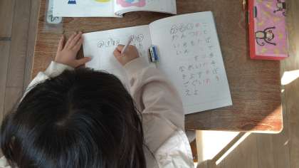 好きな動物の名前をノートの1番上に右から左へひらがな(カタカナ)で書きます。その動物の名前がわからないようにヒントになる文章をひらがな(カタカナ)の文字数分考えています。
