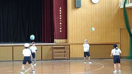 ボール(柔らかいドッジボール)を投げることとキャッチすることに慣れるために、2人または、3人で両手で、ボールを上に投げて相手がキャッチするということをたくさん練習しています。