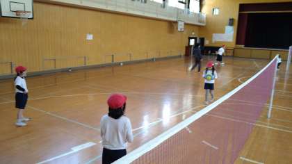体育館で「キャッチバレーボール」をしています。今回が2回目になります。