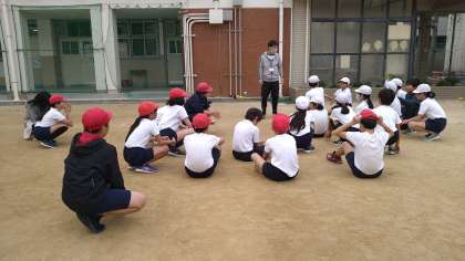 今回は2回目の学習となります。野球のゲームの流れやルールがわかる児童とわからない児童の差が大きいため、チームごとに打つ・走る・守るを繰り返し練習しています。知っている児童が教えながら、ゲームができるように練習しています。