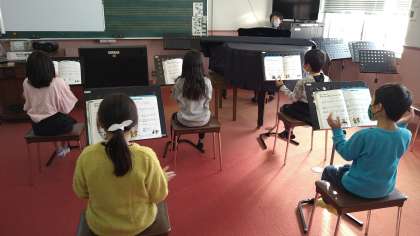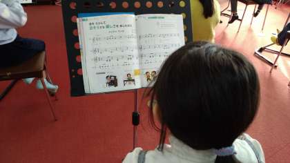 歌と手拍子で楽しんでいます。手拍子は同じリズムですが、先生の伴奏につられないようにがんばっています。