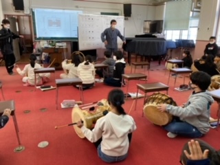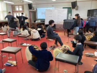 音楽と楽器についてお話しいただいた後、楽器の練習をしました。「イーチェ」という曲をチャンゴ、プク、ケンガリを使って交代で演奏しました。