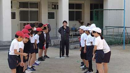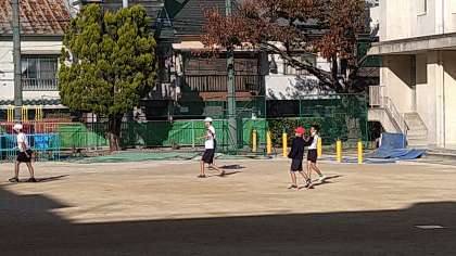 チームでの練習は得意な児童ご苦手な児童を教える場面がたくさん見られます。2チームでの試合も始まっています。