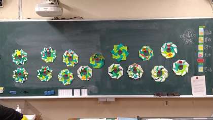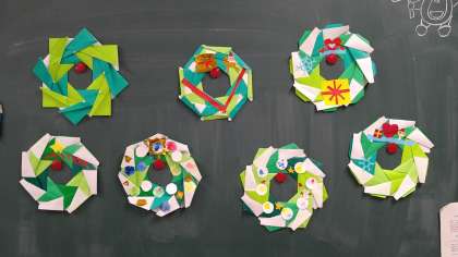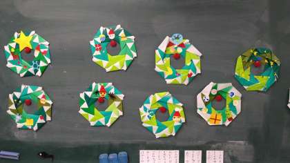 おりがみを折って作ったものを8枚重ね合わせてのり付けしてリースの輪の部分を作ります。あとは、それぞれに思い思いにデコレーションして完成させました。雪の結晶やサンタクロース、トナカイなどがあります。