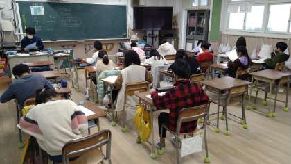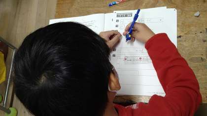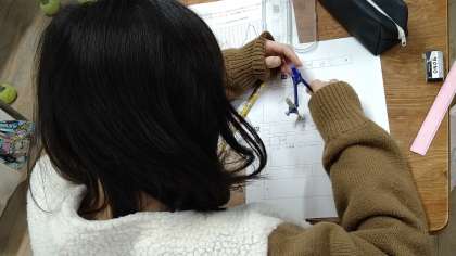 4年生も集中して取り組めています。この時間は算数で、コンパスを使用する問題が出題されています。