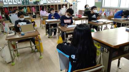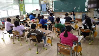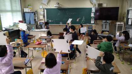 「こころを1つに」というゲームをしています。誕生日月の子どもが自分に関するクイズを出し、みんなが当てるというゲームです。全員が揃えば1つになったとなるようです。