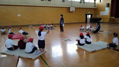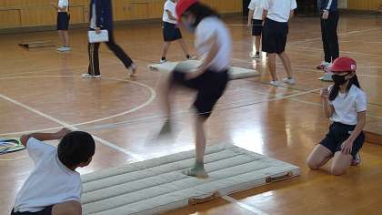 本校では高学年では、バーは竹製を使用しています。中学年では、恐怖心をもたずに取り組めるように、ゴムをバーに見立てて跳び越しています。