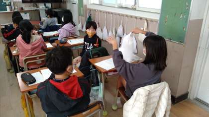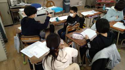 ふりこを速く動かすためにはどうすればよいかをグループで考えを出し合っています。ひもの長さ、おもりの重さをかえるなどの考えが発表されています。