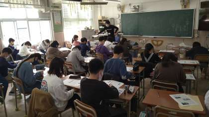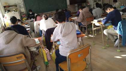「大地のつくりと変化」の単元テストにむけて表裏に印刷された2枚のプリントに取り組んでいます。