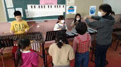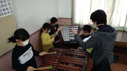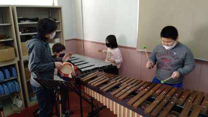 木琴・鉄琴・鈴・カスタネット・ウッドブロック・トライアングルなどの楽器を使っています。3つのグループに分かれて活動しています。
