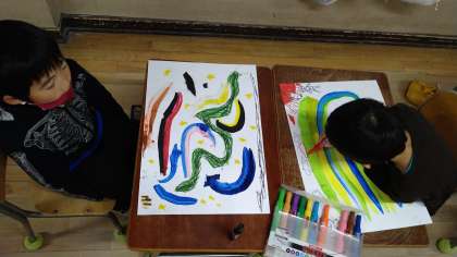 前回の学習で絵の具を虹のようにひろげた続きをしています。