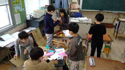 射的・スーパー(アイス・寿司など)・ケーキ・チキンをダンボールと色紙で作っています。どんなクリスマス会になるのか楽しみです。