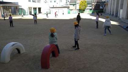 運動場でお楽しみ会をしています。