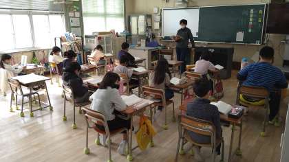 指導者の読む「かさこじぞう」に聞き入っています。読み終わった時に子どもたちから拍手が起きています。これからノートに初めて聞いた感想を書きます。