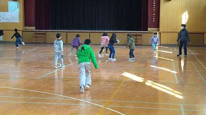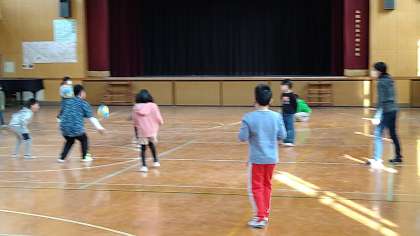 遊びの内容は、あそび係が決めています。今日の遊びは「当てボー」です。3人のボールを持っている子どもたちがボールを持っていない子どもたちを当てる変形ドッジボールのような遊びです。