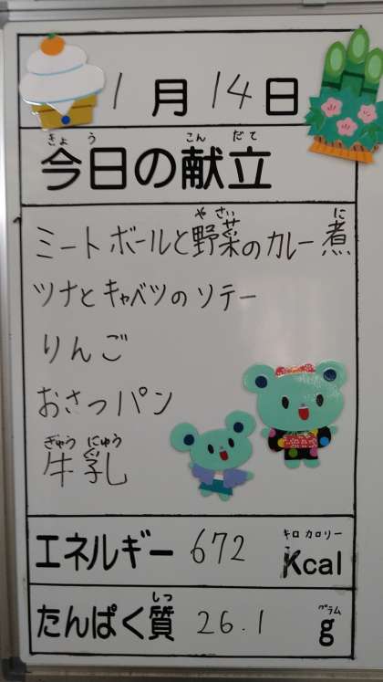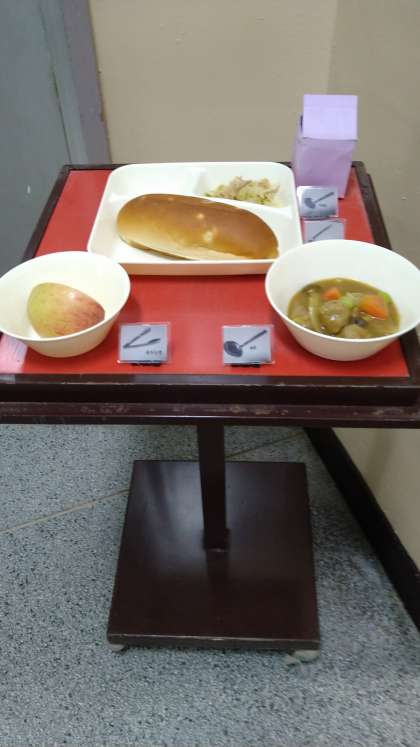 今日のパンはおさつパン(生地にさつまいもが練り込まれているもの)でした。大おかずは野菜とミートボールを煮込んだカレー煮です。