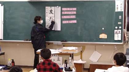 縦長の書き初め用の半紙に「友だち」と3文字を書いています。普段とは大きさの違う半紙に悪戦苦闘しながらがんばっています。