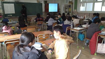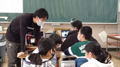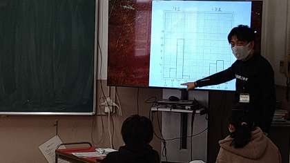 1組と2組で練習日数の違う記録を柱状グラフに表しています。そのグラフからどちらのクラスの方が回数が安定しているかを話し合っています。
