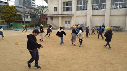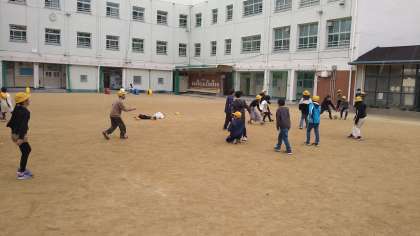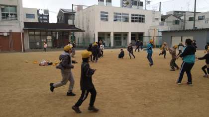 大多数は、2チームに分かれてドッジボールをしています。少人数でボールの当て合いをしている子どもたちもいます。