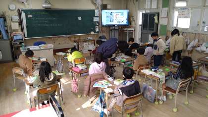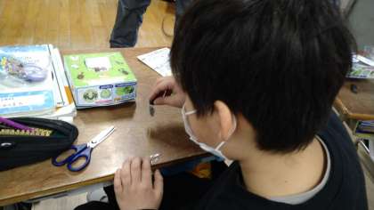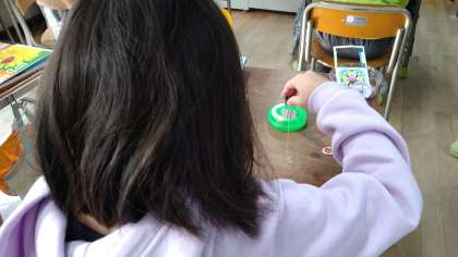 実験キットを使って磁石の力の強さを使った実験をしています。ひもに結んだフェアリーとテントウムシを磁石の力を使って宙に浮かせています。