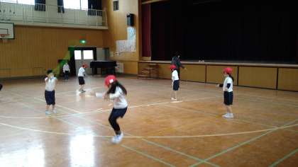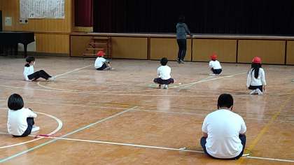 短なわと長なわを使った運動(遊び)です。短なわは後回しから前回しへのつなぎ方を練習しています。長なわはくぐり抜けをしています。