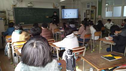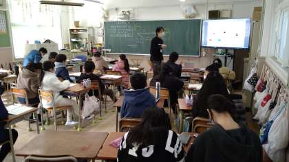 歩く速さの違う2人の人(問題では、先生とおじいさん)が向かい合って歩いてくる時に、出会うのは何秒後になるかという問題です。教室の大型モニターを使い、視覚的に考えられるようにしています。