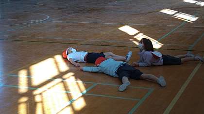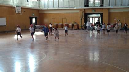 最初にこれまでの学習でおこなった鬼ごっこをして体を温めます。その後、だるまさんがころんだの変形バージョンをおこない、最後に「どこでどんな生きものが何をしている」を動きだけで表す表現遊びをおこなっています。
