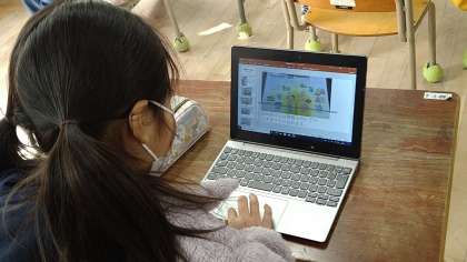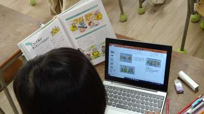 体験したことをもとに本などで調べ学習をし、タブレット端末を使いまとめています。ローマ字の表を横において、ひと文字ずつ確認しながら打っています。