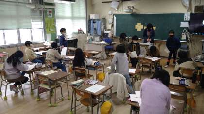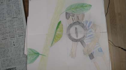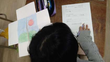 多くの子どもたちの作品は完成しています。完成した子どもたちから鑑賞カードに「すばらしい・アイデアがいいね・ていねいだね」の作品を制作した子どもたちの名前を書き、1つ(1人)の作品について感想も書いています。