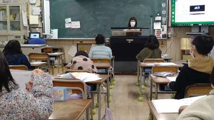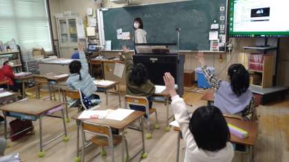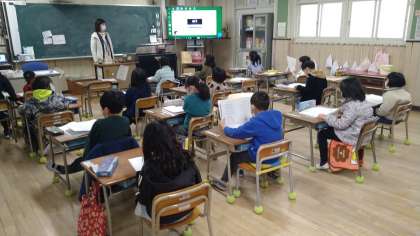 子どもたちのリクエスト曲やフルーツケーキ(3つのフルーツを子どもたちが選んで歌詞に組み入れることができる)を歌っています。後半は、卒業お祝い集会で6年生にむけて歌う前の言葉を考えています。