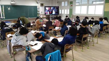 手塚治虫が中学生の時に宝塚まで歩いて帰宅した話など文章の中から手塚治虫のすごいところを出し合い、グループで交流し発表しています。