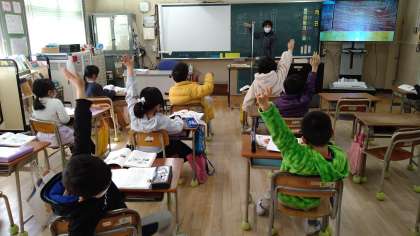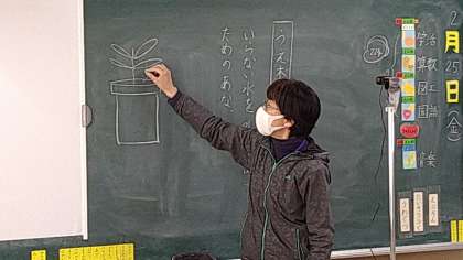 植木鉢の穴の役割について考えたことを発表しています。これまで生活で育てた経験を思い出してノートに植木鉢の穴の役割を書いています。