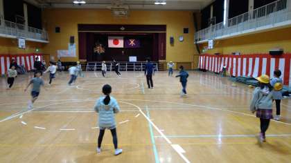 けいどろをしています。警察は先生2人で泥棒は子どもたち全員の大人対子ども対決です。けいどろが終わった後、手打ちをおこなっています。