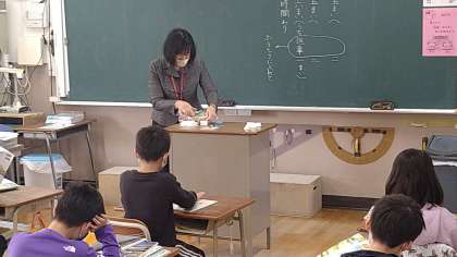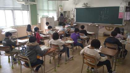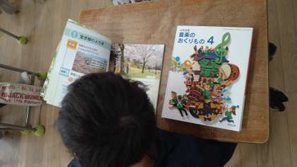 新しい教科書を配っています。真新しい教科書を開いてページ数を確認し、内容を見てわくわくしている様子が伝わってきます。