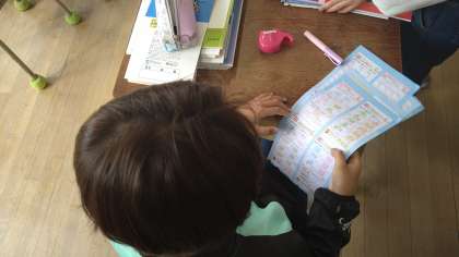 お手紙、教科書、ドリルなどの教材を配付した後、連絡帳を書いています。