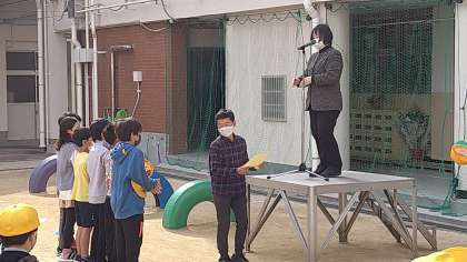 校長先生のお話、表彰、当番の先生の話(生活目標など)、連絡事項(先生・委員会)となります。今日は、今年度初めての全校朝会でした。話を聞く態度はどの学年も立派でした。今日は、ソフトボールの表彰がおこなわれました。