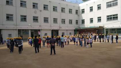 課業中の毎月始めの月曜日に全校朝会をおこなっています。