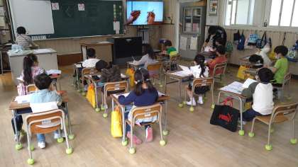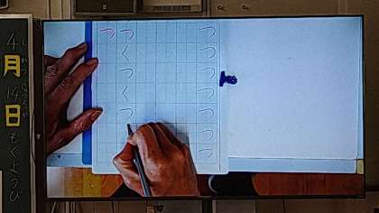 宿題になるノートの書き方を書画カメラの画像を大型モニターに映し出して説明しています。担任の書いた赤字をなぞり下の余白に練習します。ていねいに書くことをご家庭でも声をかけてあげてください。