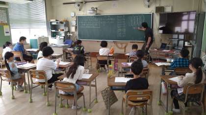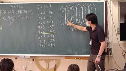 2年でしっかり練習して覚えた九九について新しい発見やどのようなきまりがあるかを見つけています。黒板のところへ行ってみんなにわかってもらえるように一生懸命説明しています。